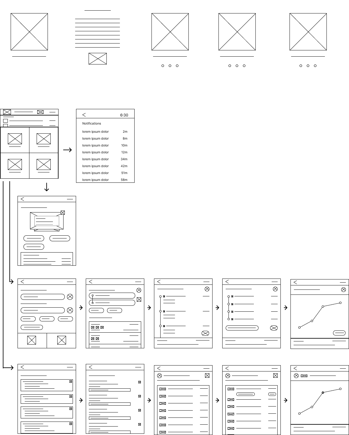 Creating the wireframes to get an idea of how the app will be laid out and interact, then moving onto the Lo-Fi prototypes.