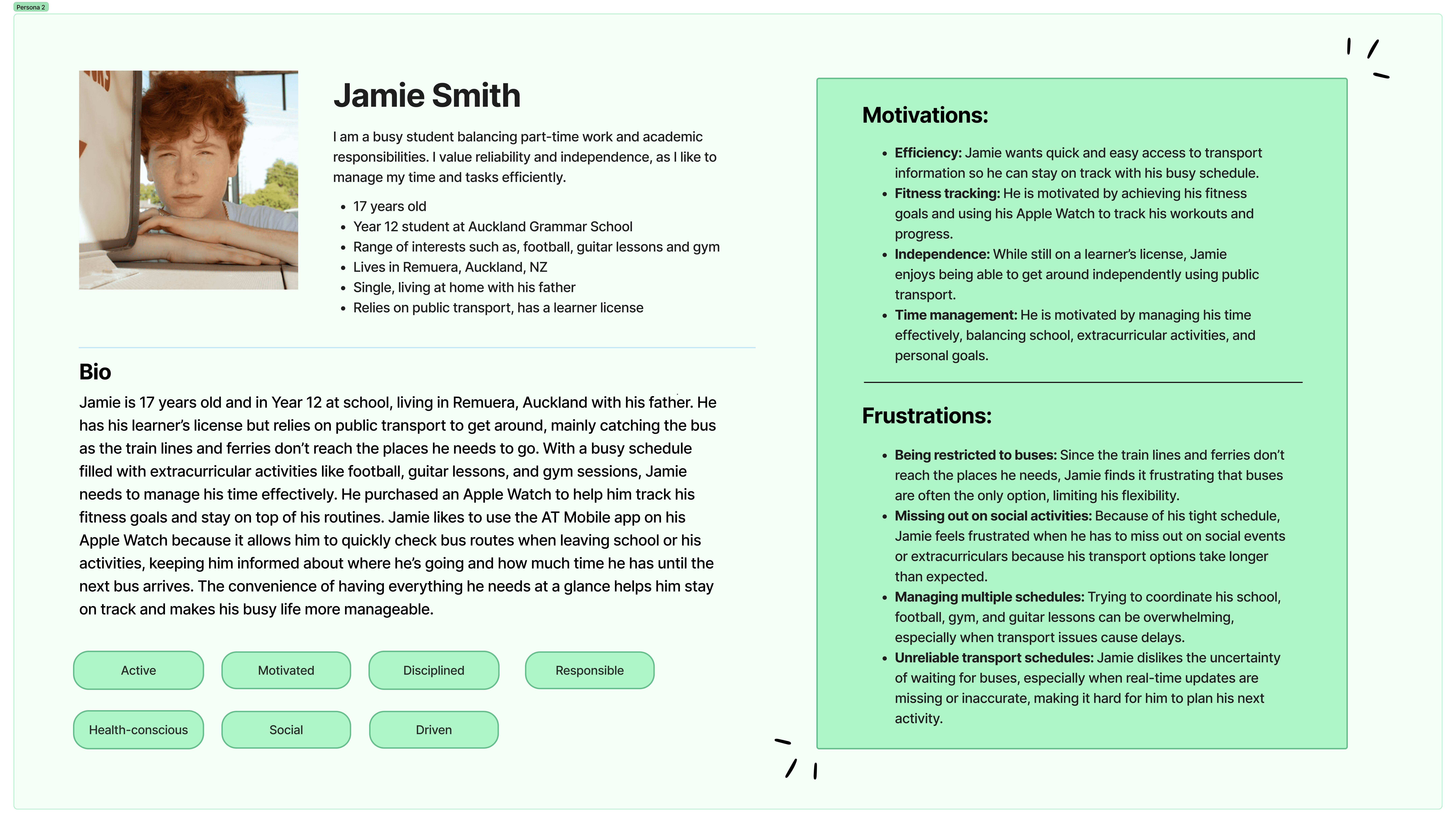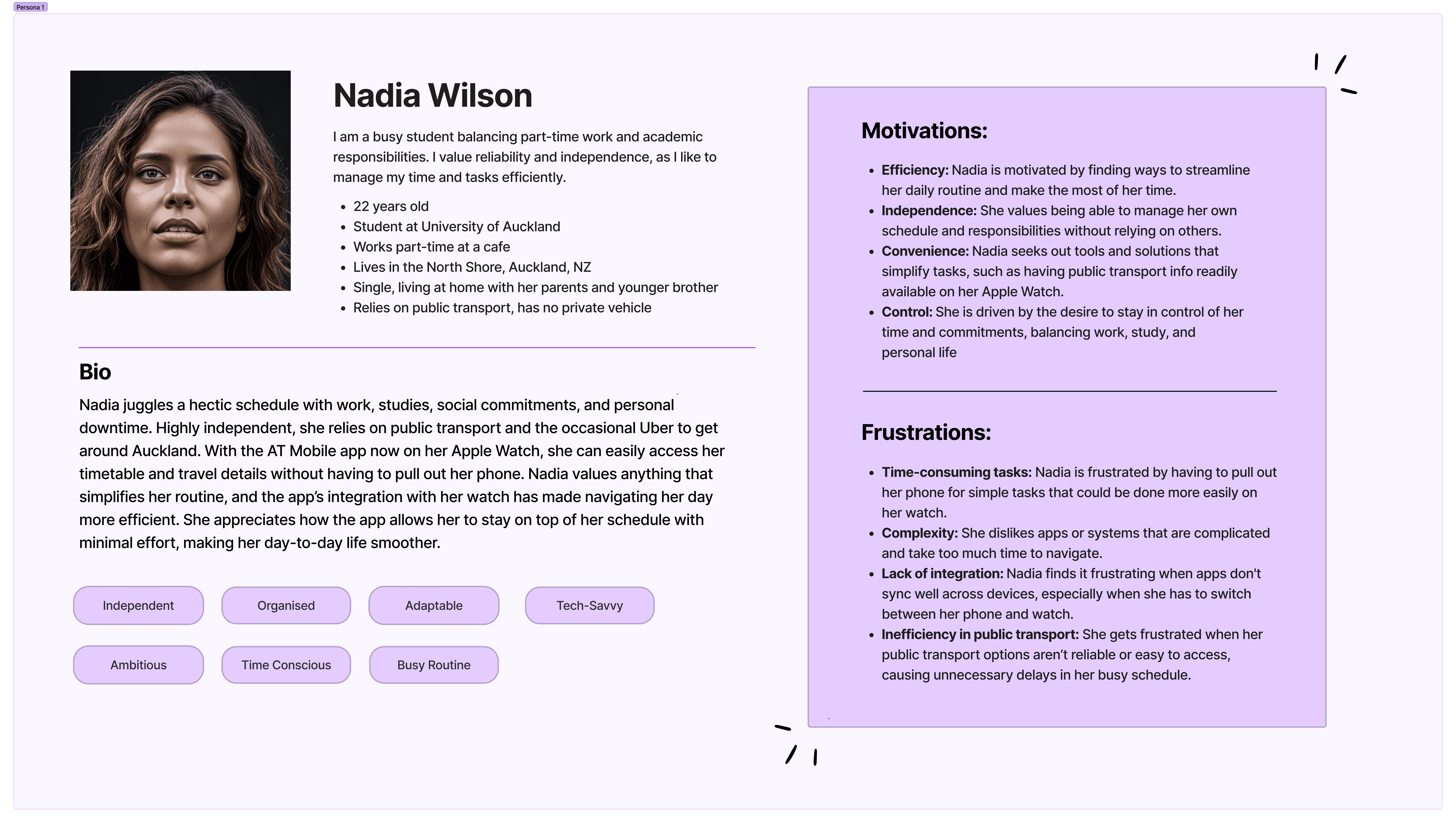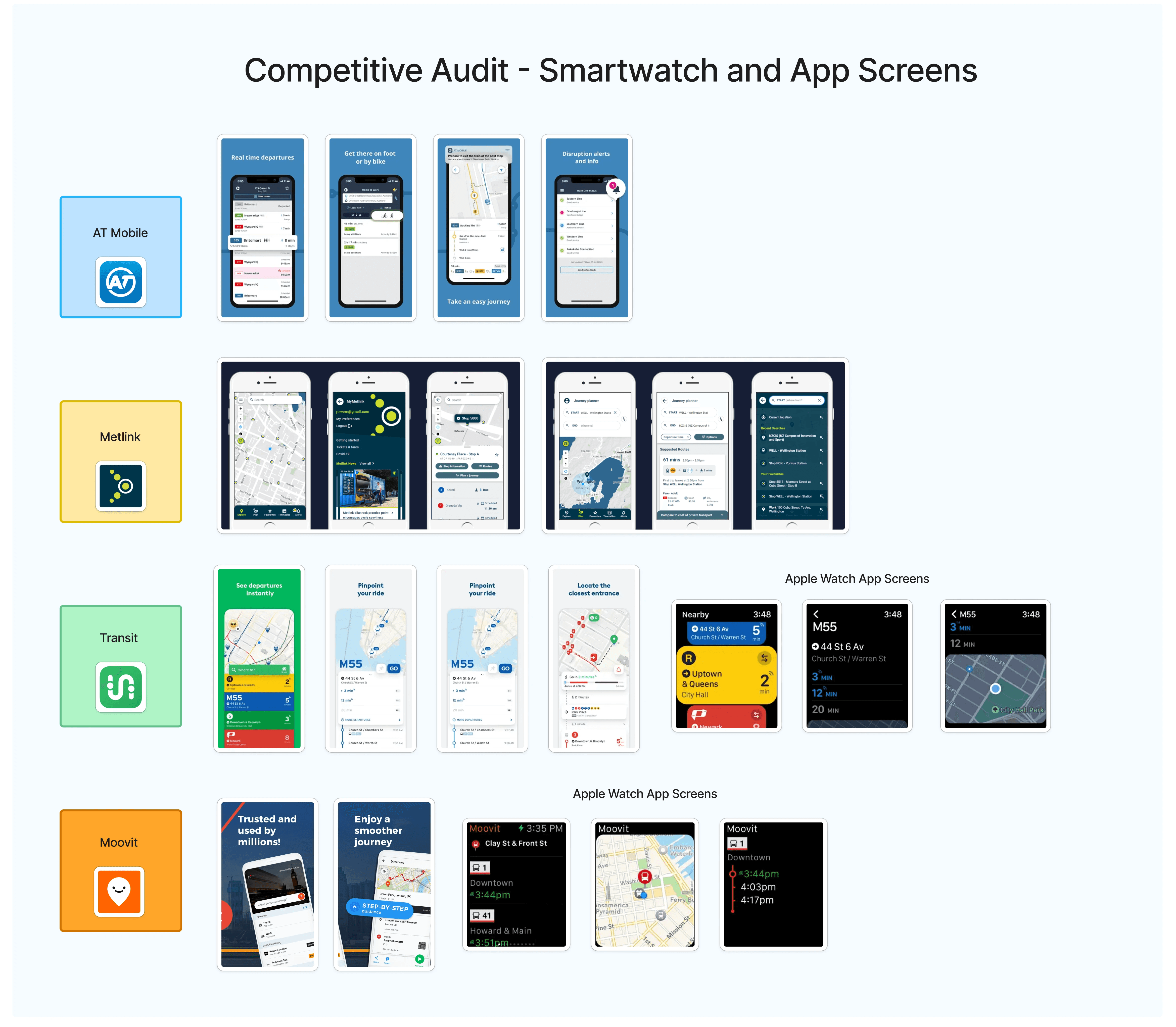 The prototype introduces an Apple Watch extension of the AT Mobile app, designed to give users quick, glanceable access to public transport information. It allows users to check real-time arrivals, receive trip alerts, and view favourite routes directly on their smartwatch. The goal is to make travel easier, reduce stress, and support confident, hands-free planning for busy commuters.