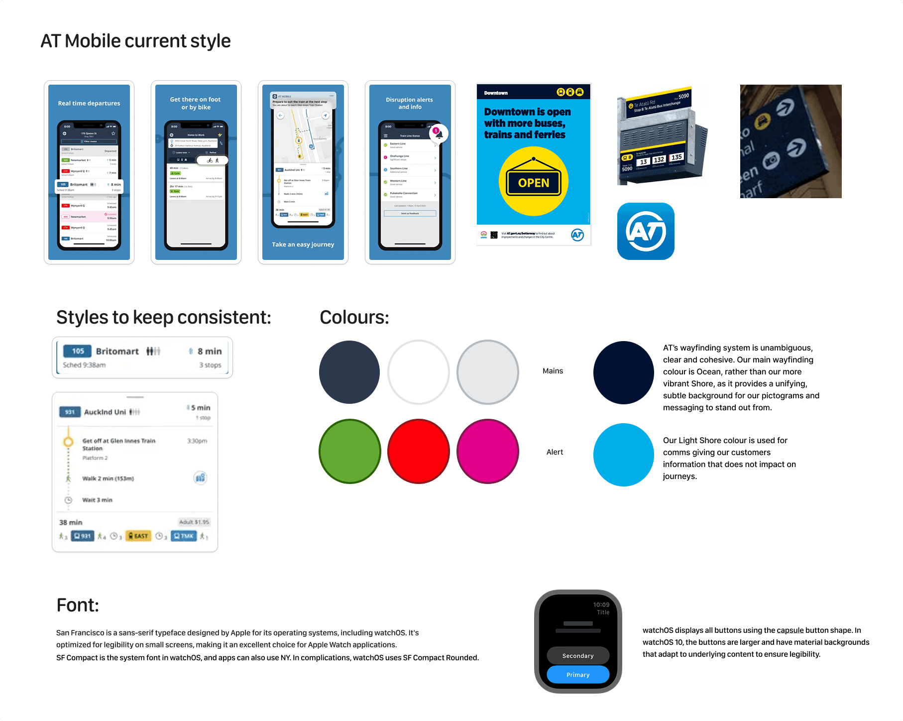 With the knowledge of areas to improve from my usability testing, I set out to make the Hi-Fi Prototypes. As Auckland Transport has an existing design system and brand identity, I made sure to keep that consistent onto the Watch App.