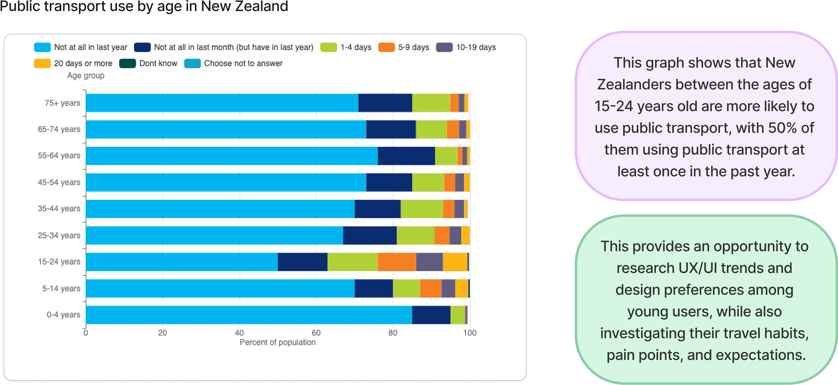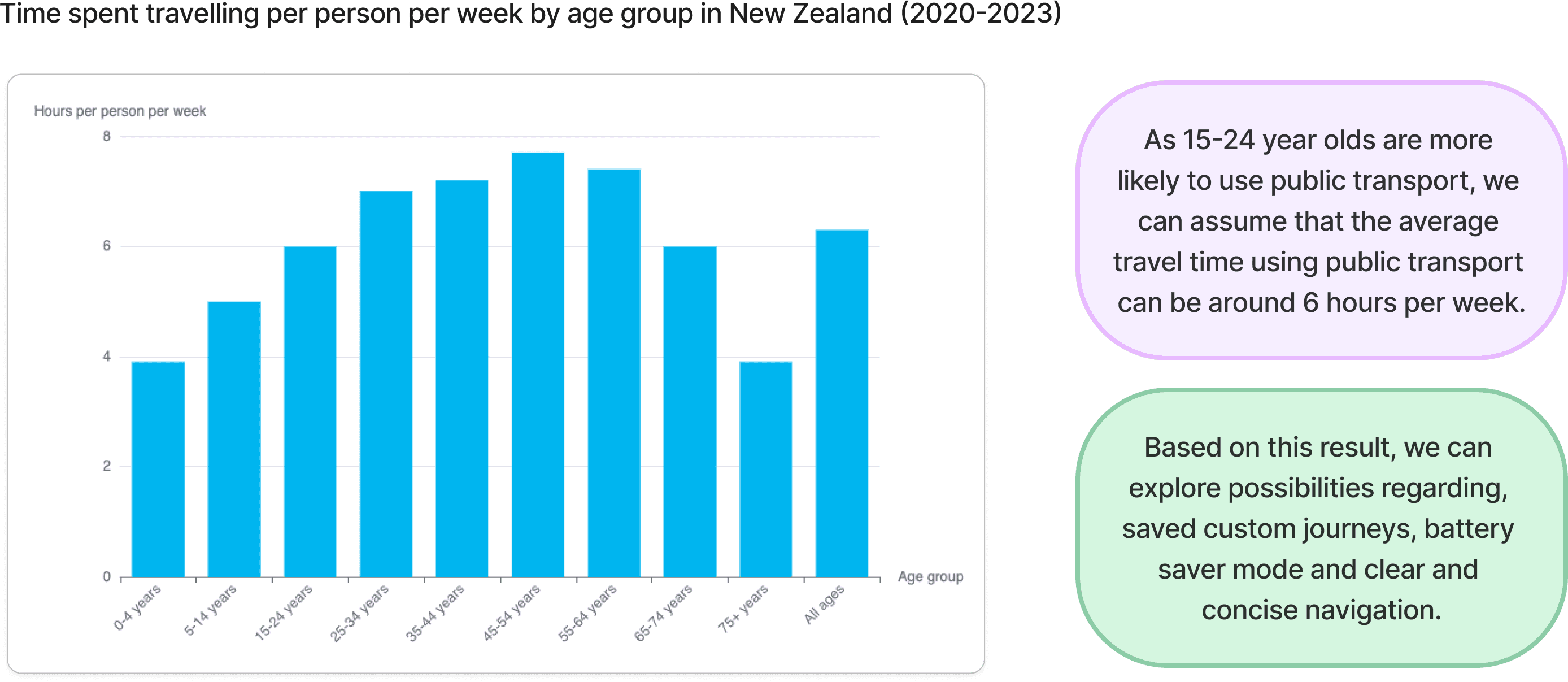 Through the quantitative data shown below, our main users are between the ages of 15-24 and use public transport for around 6 hours per week.