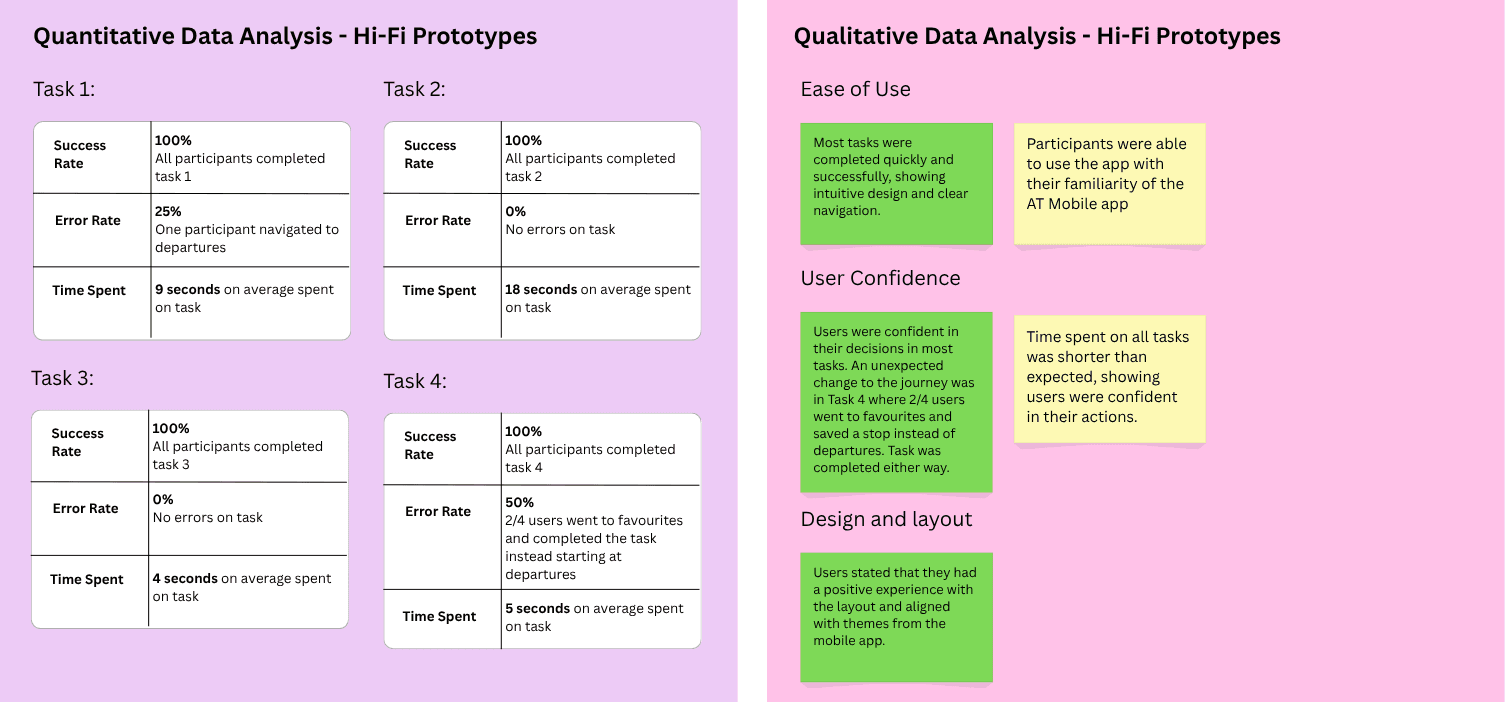 Conclusion: With the Hi-Fi Prototypes I focused on the user feedback regarding issues with a crowded homepage and unclear messaging. The goal of this usability study was to focus on if the user needs are achieved: Quick and simple way to access public transport information and support confident travel planning. Through these results, we can see that users feel confident in the app and appreciate the familiar visual branding across platforms.