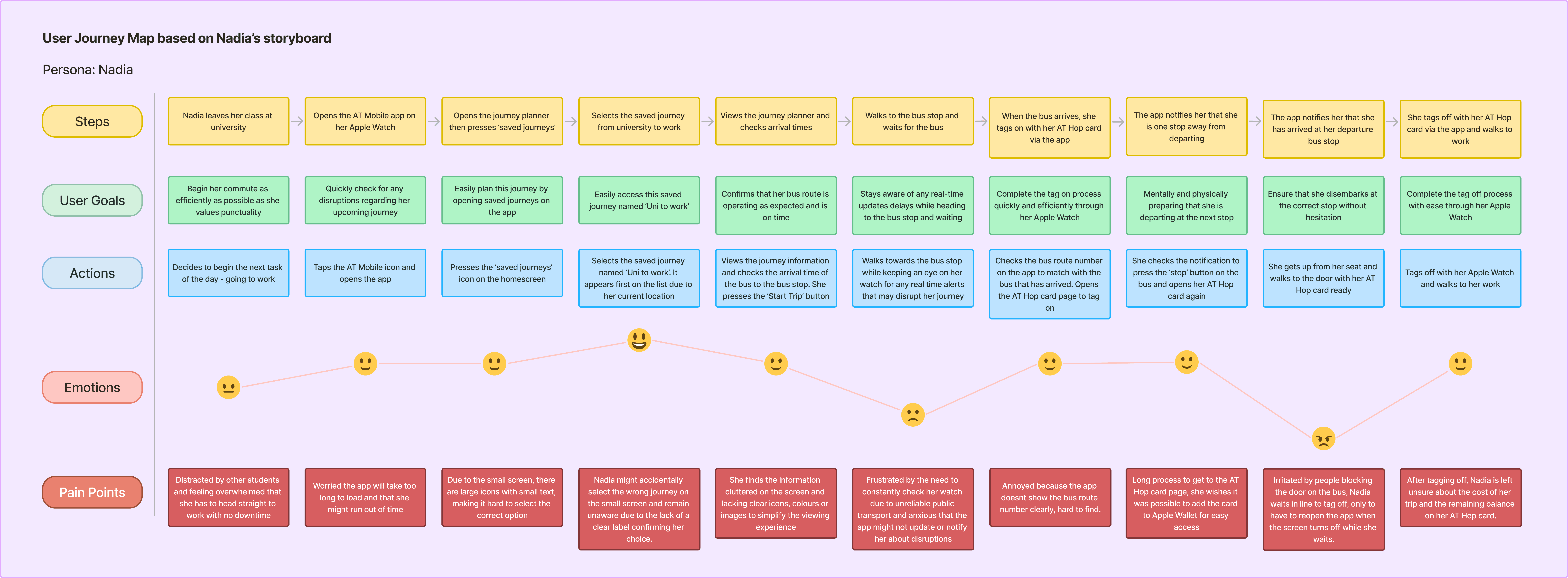 With the storyboards as a reference, I created user journey maps to identify potential pain points and highlight positive moments users might experience.