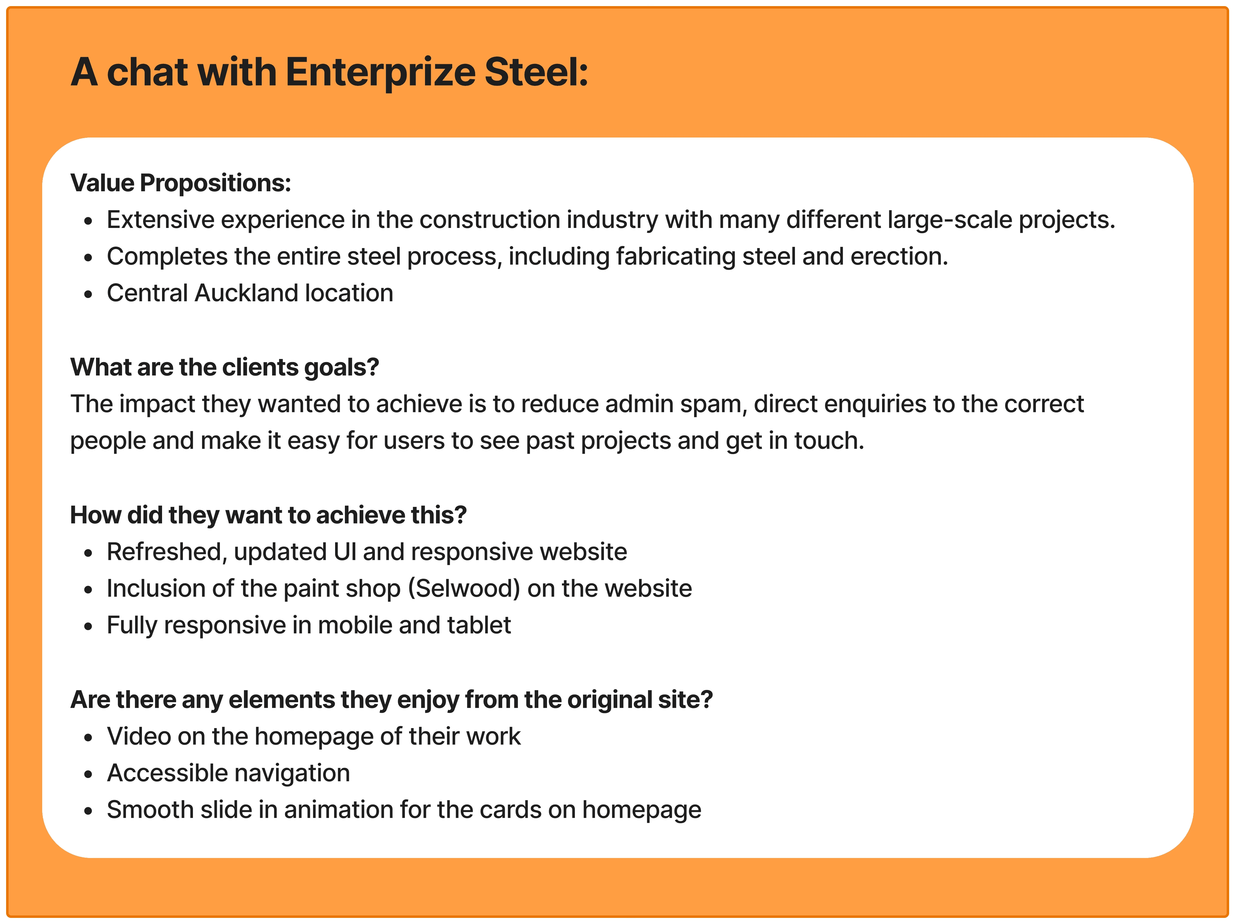 Enterprize Steel is an Auckland steel construction company with over 30 years of experience in large-scale projects. Despite their strong reputation, their outdated and inaccessible website needed a redesign to better represent the brand and remain competitive.