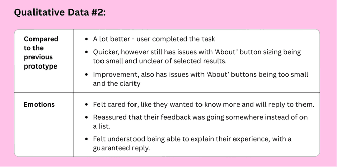 The prototype is a redesign of the current contact page, featuring a built-in feedback form and a structured layout. The new design brings all key information together in a centralised and easy to navigate layout, creating a more user-friendly and accessible experience that gives users a clear way to share feedback while helping them feel heard, supported, and valued.