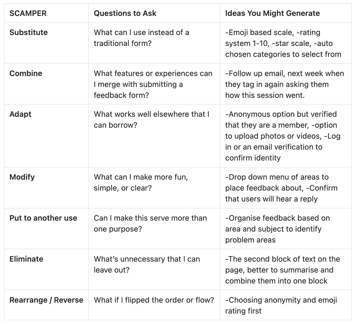 Focusing on the user need "I need to report issues so they can be addressed and my gym experience can improve." I did some brainstorming using the SCAMPER method and Crazy 8's.